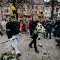 Mit der Schmiedestandarte voran marschierten wir mit 18 Mitgliedern vom Gewerk der Bergschmiede und deren Freunde am 10.12.2025 kurz nach 18:30 Uhr auf dem Freiberger Christmarkt.