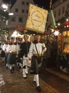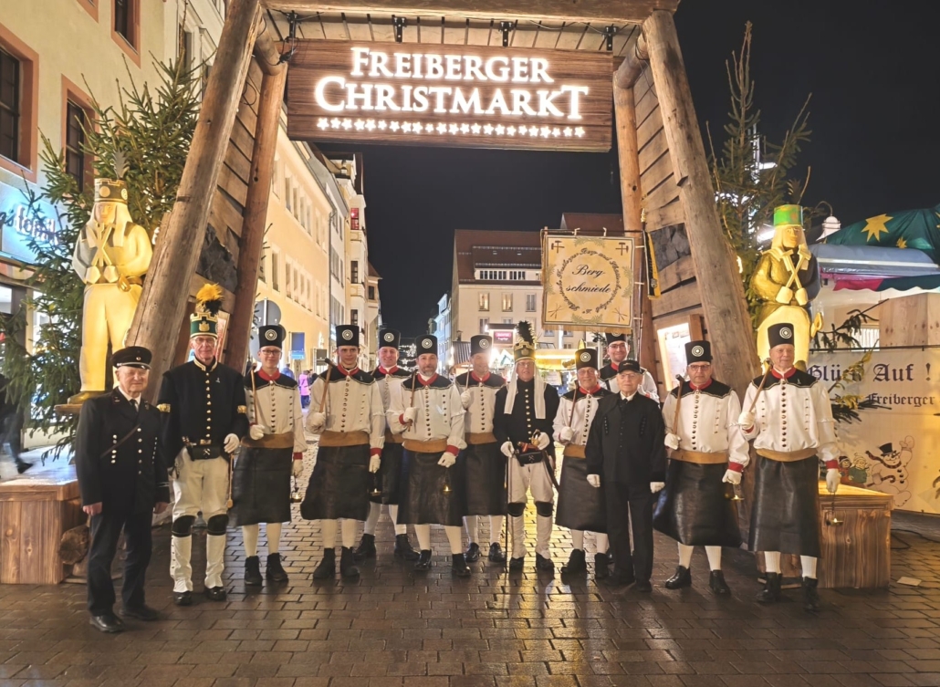 Mit der Schmiedestandarte voran marschierten wir mit 18 Mitgliedern vom Gewerk der Bergschmiede und deren Freunde am 10.12.2025 kurz nach 18:30 Uhr auf dem Freiberger Christmarkt.