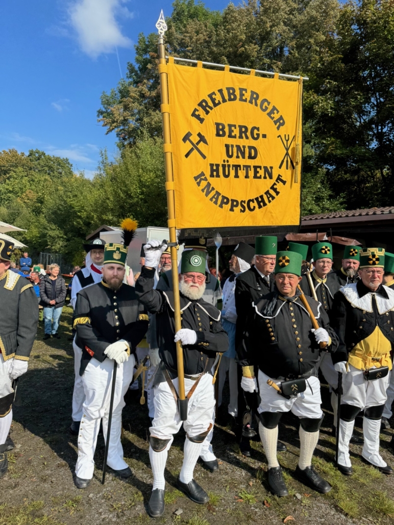 Unser Verein war eingeladen als einer von 15 anwesenden Vereinen, am 28. September 2025 an den Feierlichkeiten zum 25. Jahrestag der Gründung des Zschopenthaler Hüttenvereins teilzunehmen. Die weitesten Gäste kamen aus Rüdersdorf in Brandenburg. Wir reisten im Kleinbus zur Waldkirchener St. Georgs-Kirche (die gleichzeitig ihr Kirchweihfest feierte). Das Wetter war hervorragend, blauer Himmel, warme Temperaturen und gute Laune begleiteten uns. Nach dem Gottesdienst an diesem Sonntag formierten wir uns in der Marschordnung. Das Marschband war bekannt, wurde aber auch noch mit kleinen Kartons mit Aufschrift und Bild der Teilnehmer-Paraden auf der Dorfstraße gekennzeichnet. Das war eine sehr gute Lösung, schnell den Ort des Paradestellens zu finden, ohne die Straße besprühen zu müssen. Wir durchliefen 2 km das Dorf bis zum Hof des Historischen Blaufarbenwerkes am Ufer der Zschopau, neben der Ralle-Mühle. Viele Gäste und Touristen freuten sich am Rande der Marschroute über die vielen Hüttenleute. Nach der Begrüßung durch die Landkreisleitung und des gastgebenden Vereins überreichten einige erzgebirgische Paradeteilnehmer Geschenke an die Zschopenthaler zu Ihrem 25. Jubiläum. Die Teilnehmer der Parade wurden vorgestellt. Verpflegung und die Durstbekämpfung waren kein Problem, es war für Teilnehmer und Gäste genug vorbereitet. Musikalisch ging es weiter mit Akkordeonmusik und volkstümlichen Liedern. Ab 16.00 Uhr zogen sich die ersten Gäste zurück und traten die Heimreise an. Wir erreichten wohlbehalten am frühen Nachmittag Freiberg.